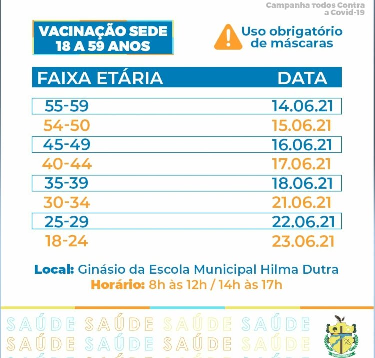 A Prefeitura de Barreirinha, por meio da Secretaria Municipal de Saúde (Semsa) e Programa Nacional de Imunizações (PNI), divulgou hoje o cronograma de vacinação da faixa etária de 18 a 59 anos.